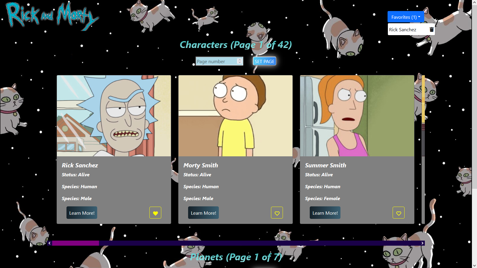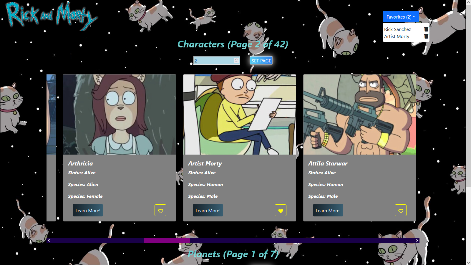 Proyect for 4Geeks Academy. It's an app that consumes an external API and shows relevant content using React. The Rick and Morty API shows the information paginated, so it was added an option to choose the page. For each character you can click Learn More and shows detailed information (also obtained from the API).