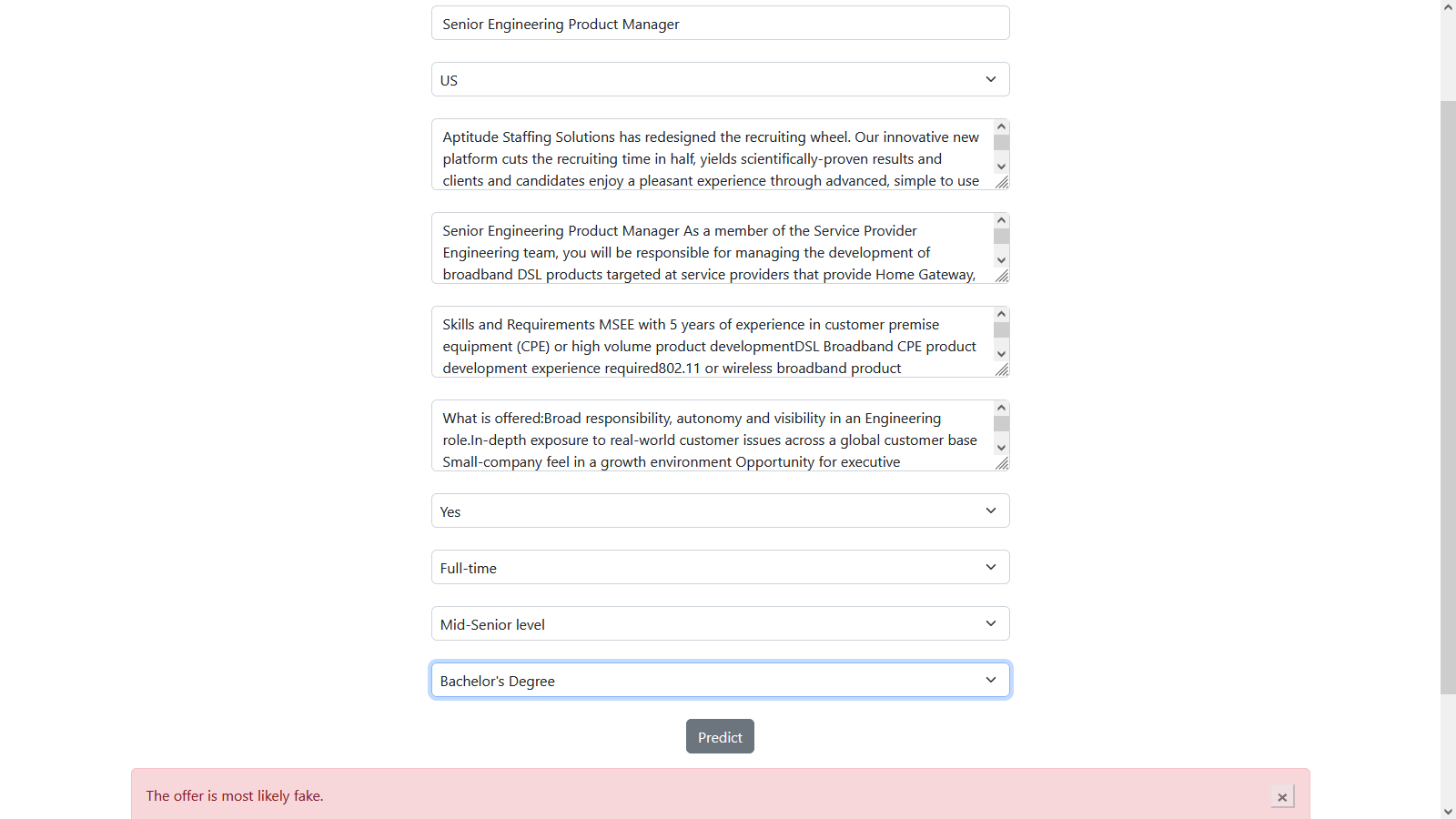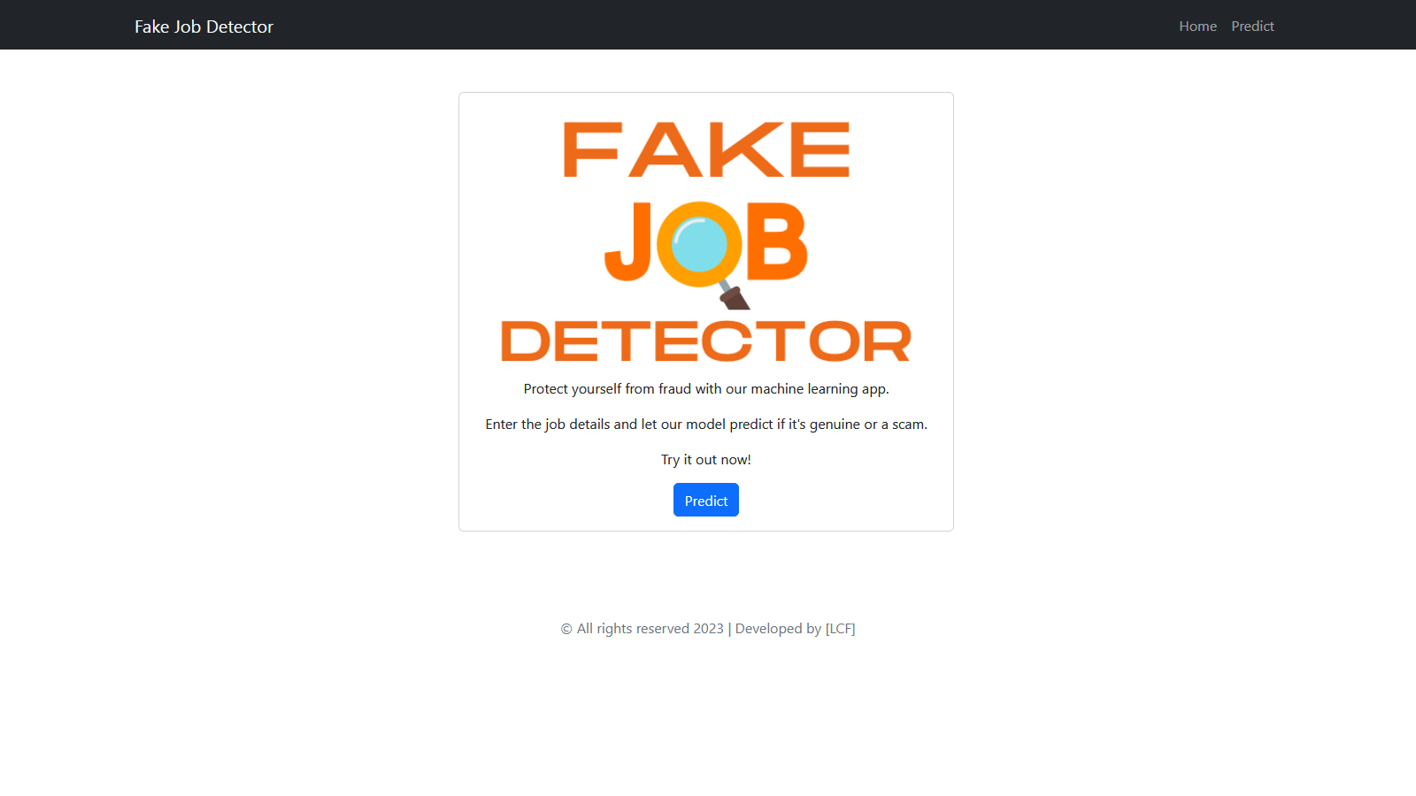 Django application that uses a Logistic Regression model (Machine Learning) to predict whether a job offer is fake. The repository includes the Jupyter Notebook file where the model was fit.